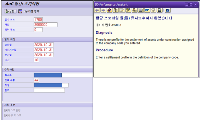 - 보통 신규 회사코드를 추가하는 경우 아래와 같은 오류가 발생될 수 있습니다. 따라서 회사코드에 FI-AA 정산 프로파일을 추가해야 합니다.