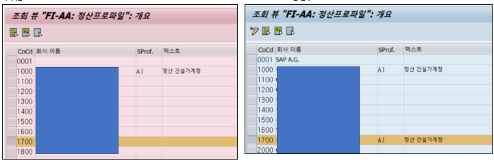OAAZ (FI-AA 정산 프로파일 유지보수) 확인 시 아래와 같이 대상 회사코드 1700에 프로파일이 설정되지 않은 것이 원인