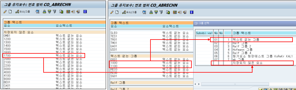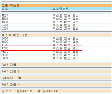 같은 시스템 상에 문제 없는 1000, 1100 관리회계영역과 달리 1700 관리회계 영역은 그룹에 지정되지 않은 상태임을 확인 가능 - 오류 발생의 원인