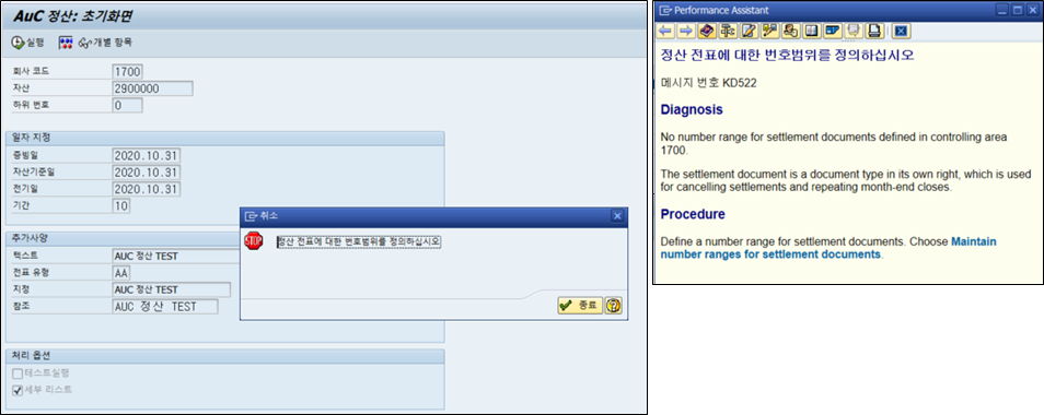 AIAB에서 AuC( Asset Under Construction ) 정산 시 아래와 같이 "정산 전표에 대한 번호범위를 정의하십시오"라는 메세지(Message KD522)가 발생됨 - 보통 신규 추가된 관리회계 영역에 대해 번호범위를 지정하지 않는 경우 발생됩니다.