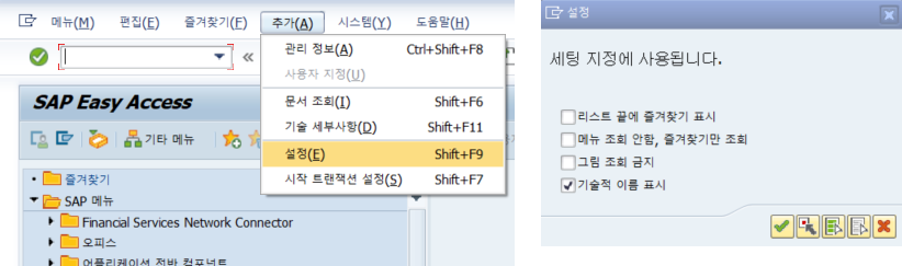 메뉴 패스에 트랜잭션 코드가 보이지 않는다면, 아래와 같이 [기술적 이름 표시]를 설정해주면 확인하실 수 있어요!