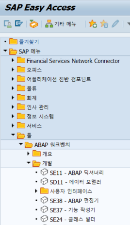 SAP 메뉴 > 툴 > ABAP 워크벤치 > 개발 폴더에서 관련 트랜잭션들을 확인 할 수 있습니다.