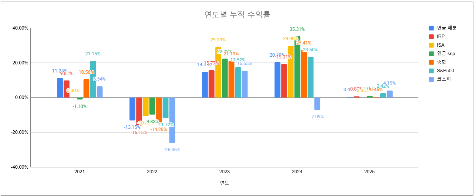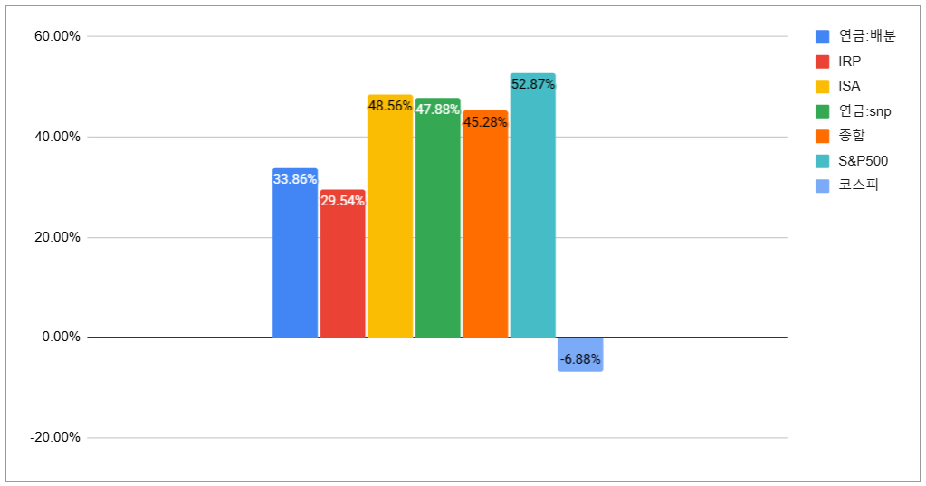| 연도 | 연금:배분 | IRP | ISA | 연금:snp | 종합 | S&P500 | 코스피 |
