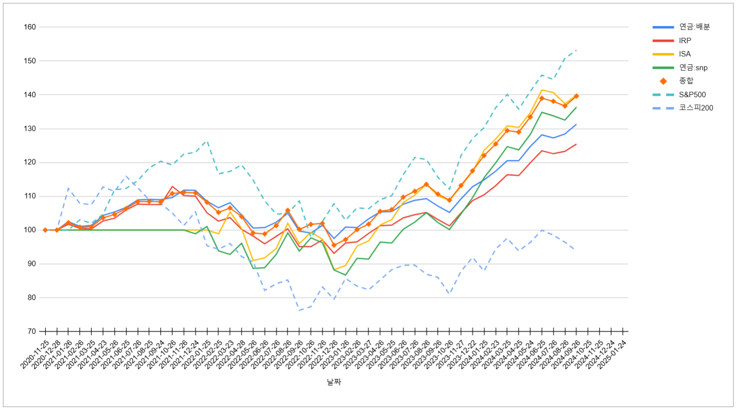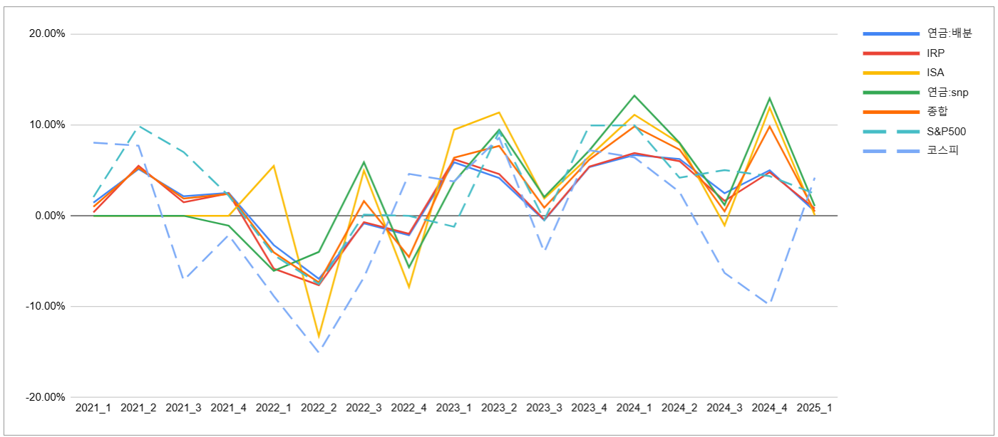 | 계좌구분 | 연금:배분 | IRP | ISA | 연금:snp | 종합 | S&P500 | 코스피 |