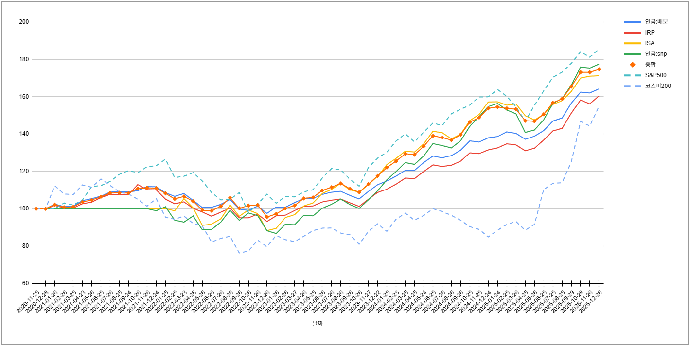 블로그에 공유하고 있는 연금저축, IRP, ISA 계좌들과 비교 지수(코스피, S&P500)를 시간가중 방식으로 인덱스를 계산하여 그래프로 표시했습니다.