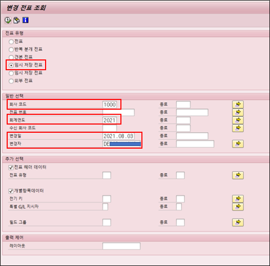 - 변경자 : 임시전표를 삭제한 사용자의 SAP ID 입력